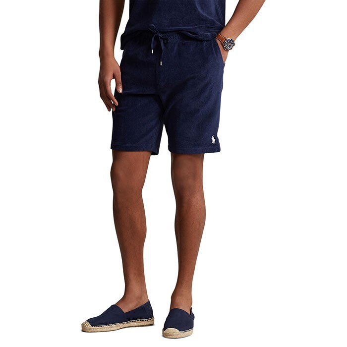 Polo Ralph Lauren's cotton-blend terry shorts are washed for softness and feature a comfy adjustable waistband.Product FeaturesApprox. inseam: 7-3/4"; 12-1/4" riseElastic drawstring waistbandEven vented hemsTwo front angled pocketsBack right patch pocketSignature embroidered Pony on left hemCotton/polyesterMachine washableImported