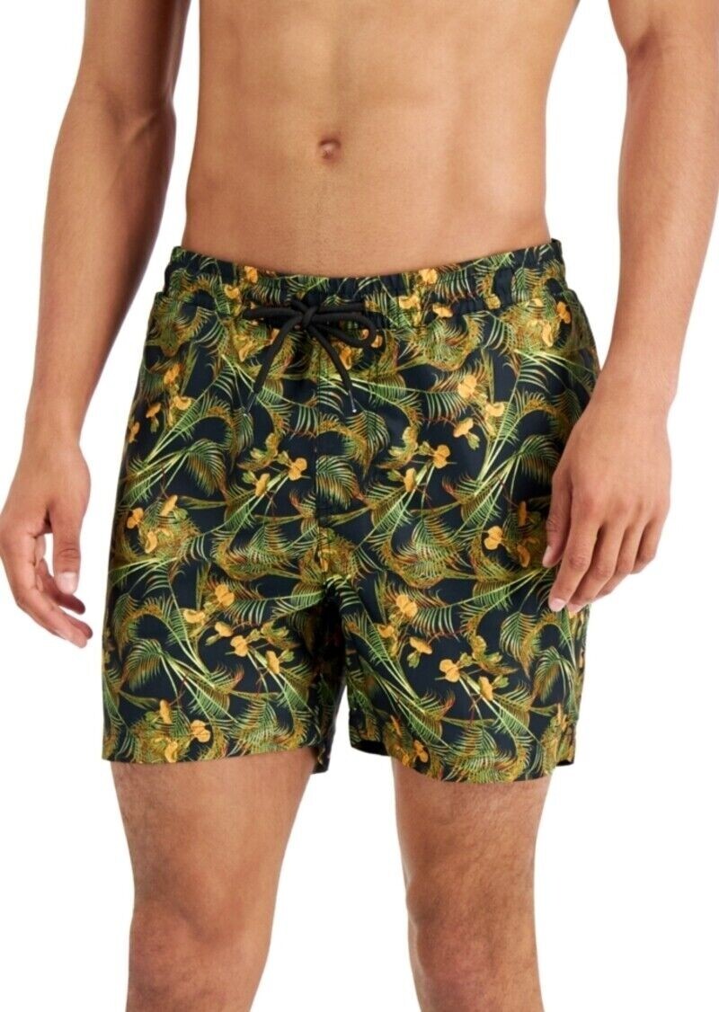 Inc Men's Regular-Fit Quick-Dry Tropical Palm-Print 5" Swim Trunks Multi-Large