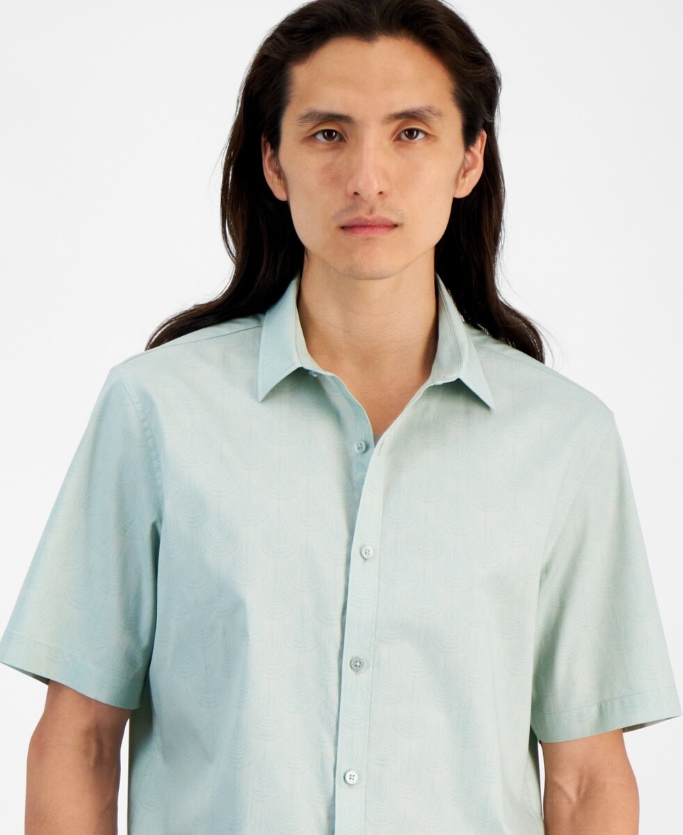 The perfect choice for warm-weather style and comfort, this Fern shirt from Alfani is styled in crisp cotton poplin finished with a stylish print.Product FeaturesApprox. 31" longRegular fitPoint collarShort sleevesGeometric patternStretch performanceAll cottonMachine washableImported