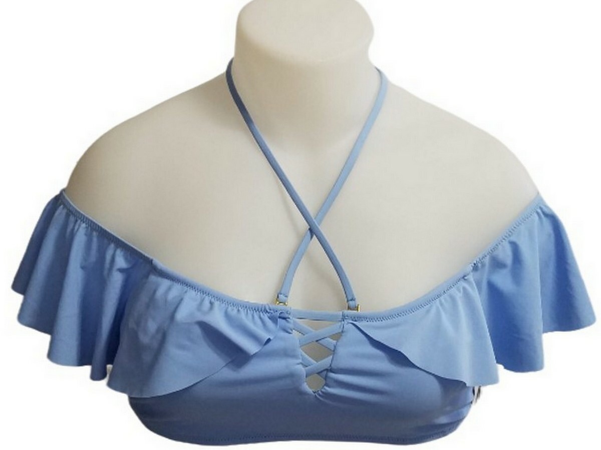 This Raisins Juniors Women Barbados Off-The-Shoulder Ruffled Lace-Up Bikini Top (L) is the perfect addition to your swimwear collection. The top features a solid blue color with lace accents and an off-the-shoulder style, making it both stylish and comfortable. The ruffled design adds a playful touch, while the spandex and nylon material ensures a durable and comfortable fit.