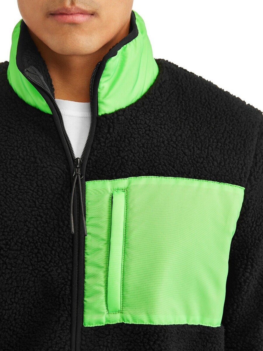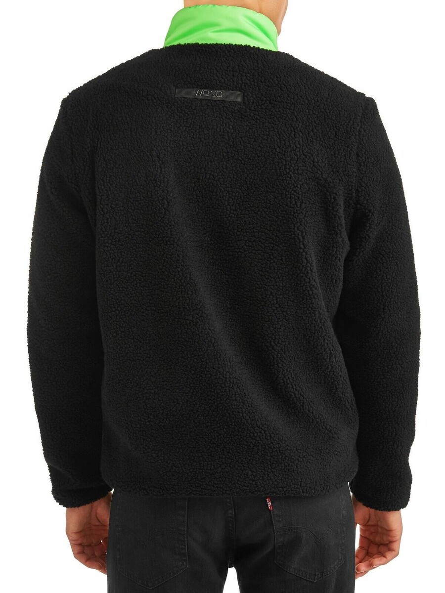 WeSC Moritz Mixed-Media Sherpa Slim Fit Fleece Jacket Black Neon Green-Size XL