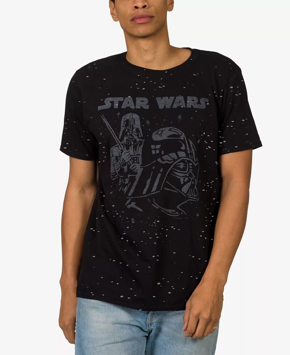 May the force be with you in this star wars T-shirt. Featuring dearth vader's profile and finished with white paint splatter technique, this black flea market T-shirt is a hit in any galaxy.
