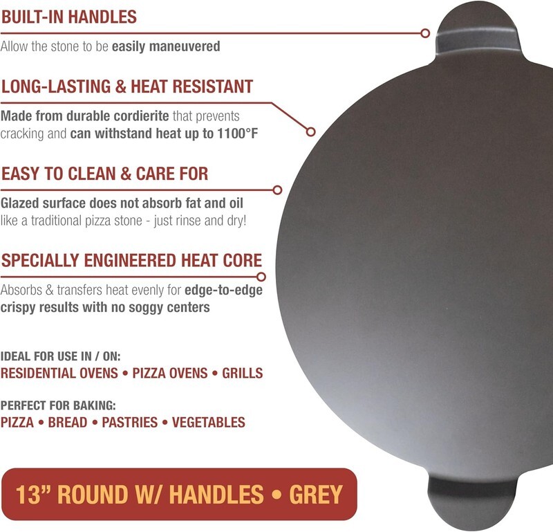 Ideal for use in residential ovens, pizza ovens, and grills, this baking stone absorbs heat and transfers it evenly for even baking with a specially engineered heat core that eliminates soggy centers, ensuring your baked goods are cooked to perfection