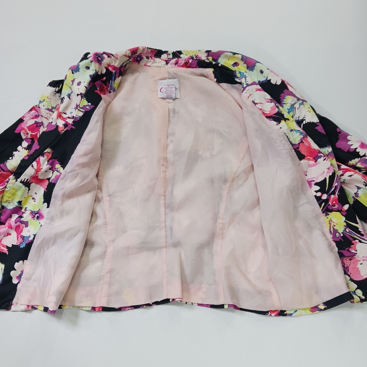 The Candie's RN#73277 Women's Multicolor Cotton Blend Floral Blazer in size Medium is a stylish and versatile piece perfect for a business setting. Made from a blend of polyester, spandex, and cotton, this blazer features a vibrant floral pattern and long sleeves, making it a standout addition to any wardrobe. The single-breasted design with a lined interior adds a touch of sophistication, while the machine washable material ensures easy care and maintenance. This blazer is sure to elevate your professional look with its eye-catching design and quality construction.