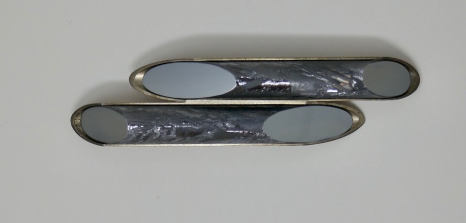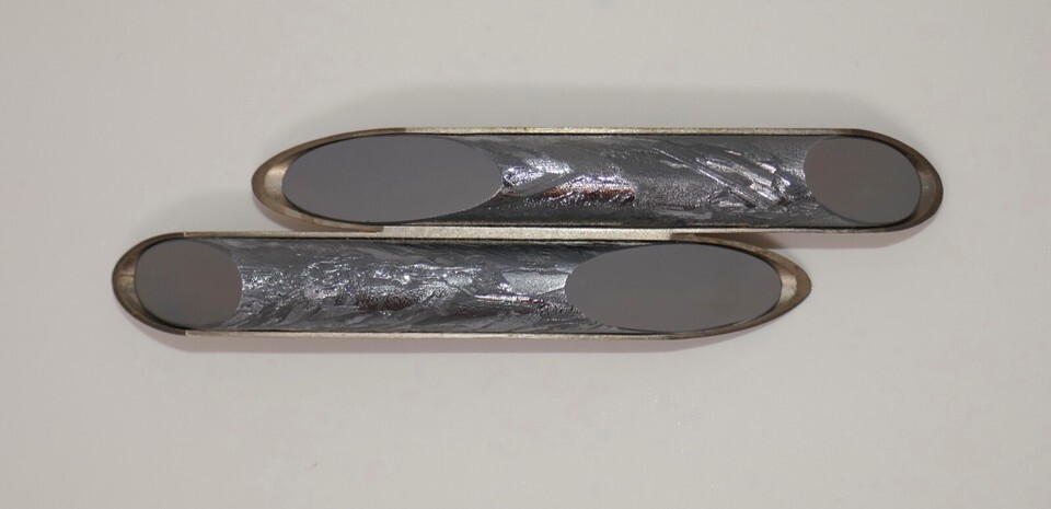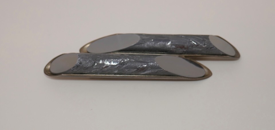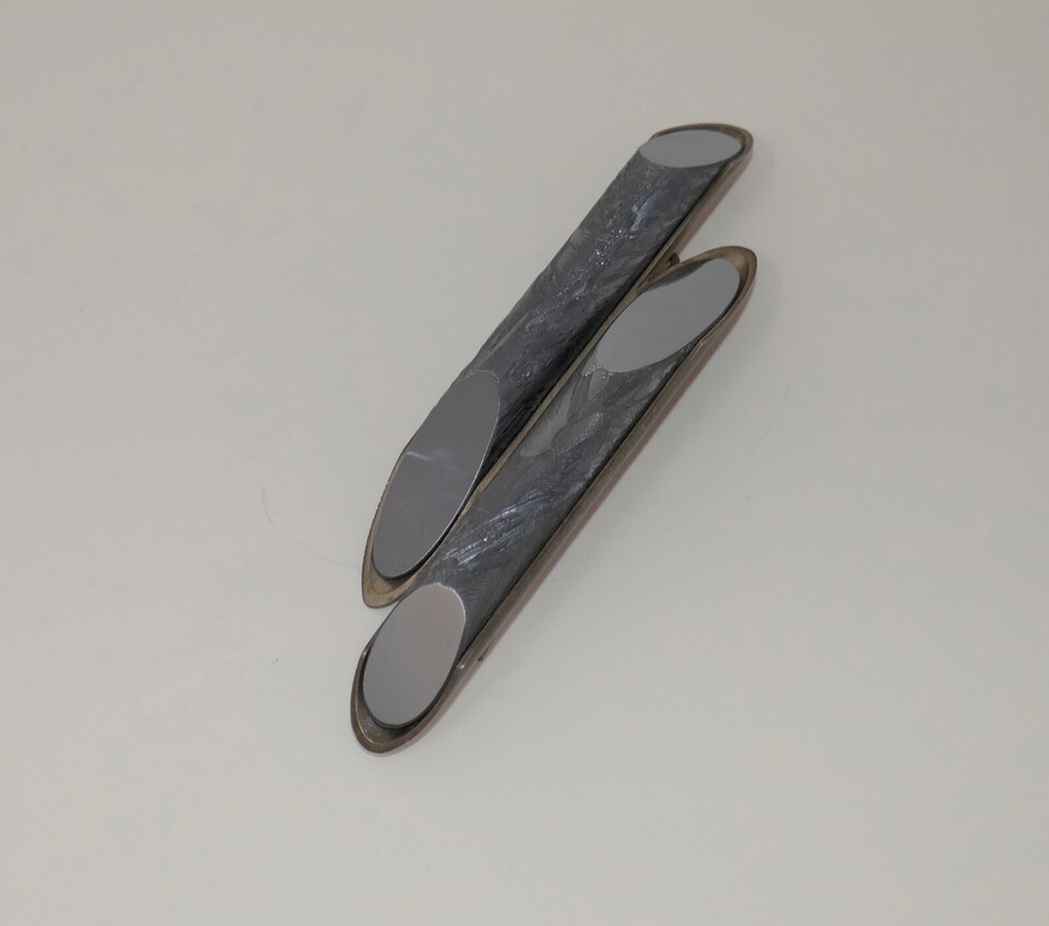 Add a touch of elegance to your outfit with this vintage Marius Pajaczkowski brooch pin. The intricate design features a stunning silver and hematite combination that is sure to catch any eye. The piece is signed and made of 925 silver, making it a rare find for collectors. Its original and authentic design makes it a great addition to any collection or a unique gift for a loved one. Made in Poland, this brooch pin is a one-of-a-kind treasure that will surely make a statement. This large statement brooch features two parallel hematite rods with texturing along the main body of each, and polished slanted ends. These two hematite rods fit into the curved sterling setting beneath as shown. Measures 3.125" long by .75" wide, and weighs 25.8 grams.