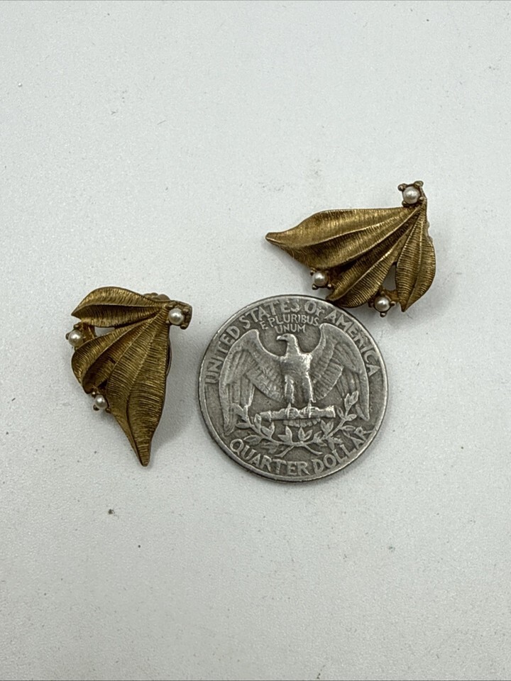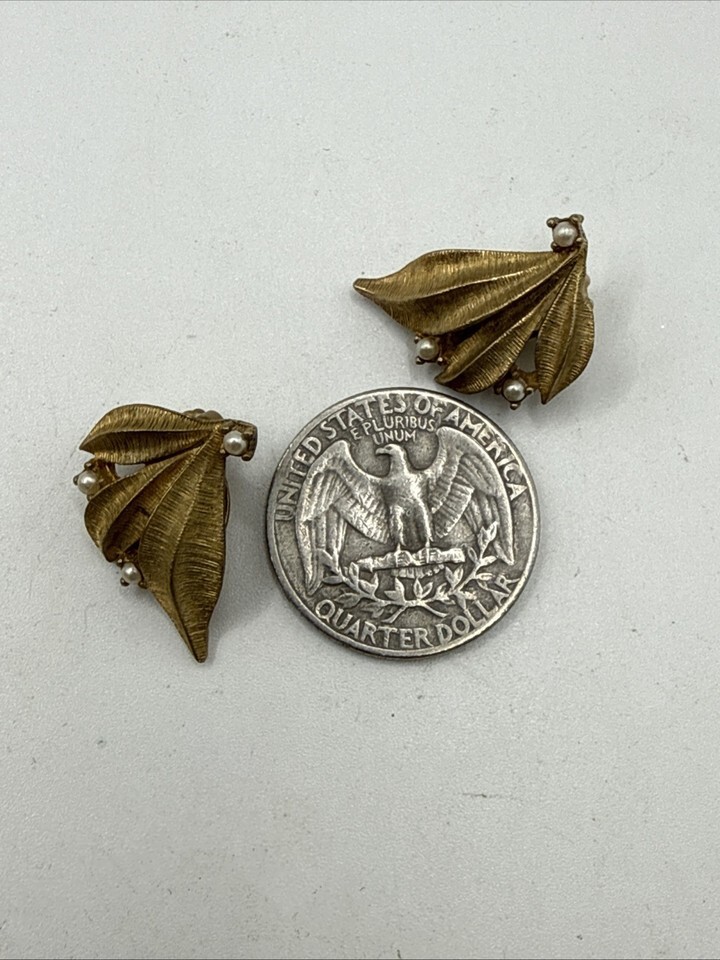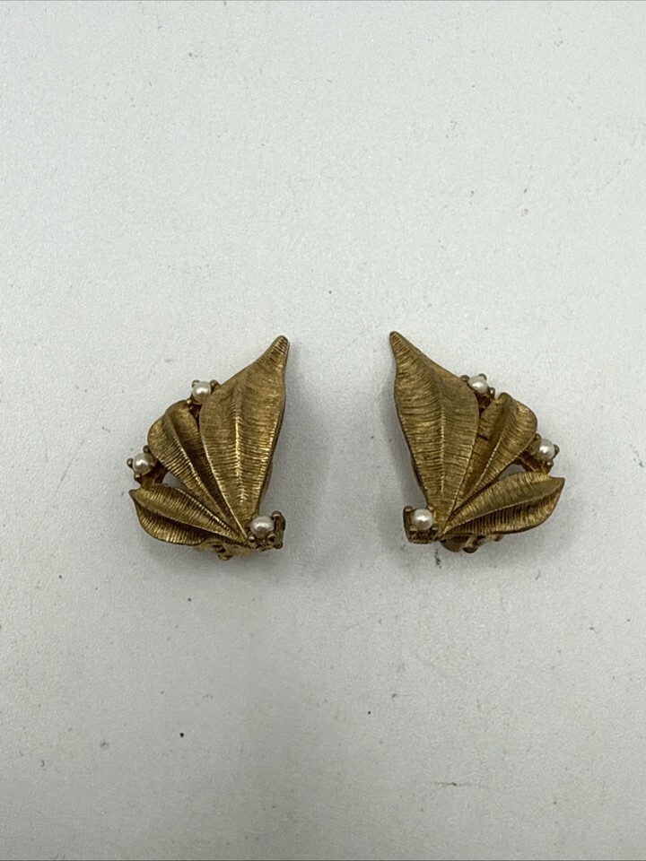 Vintage Ciner Seed Pearl Gold Tone Leaf Flower Petal Feather Clip-On Earrings