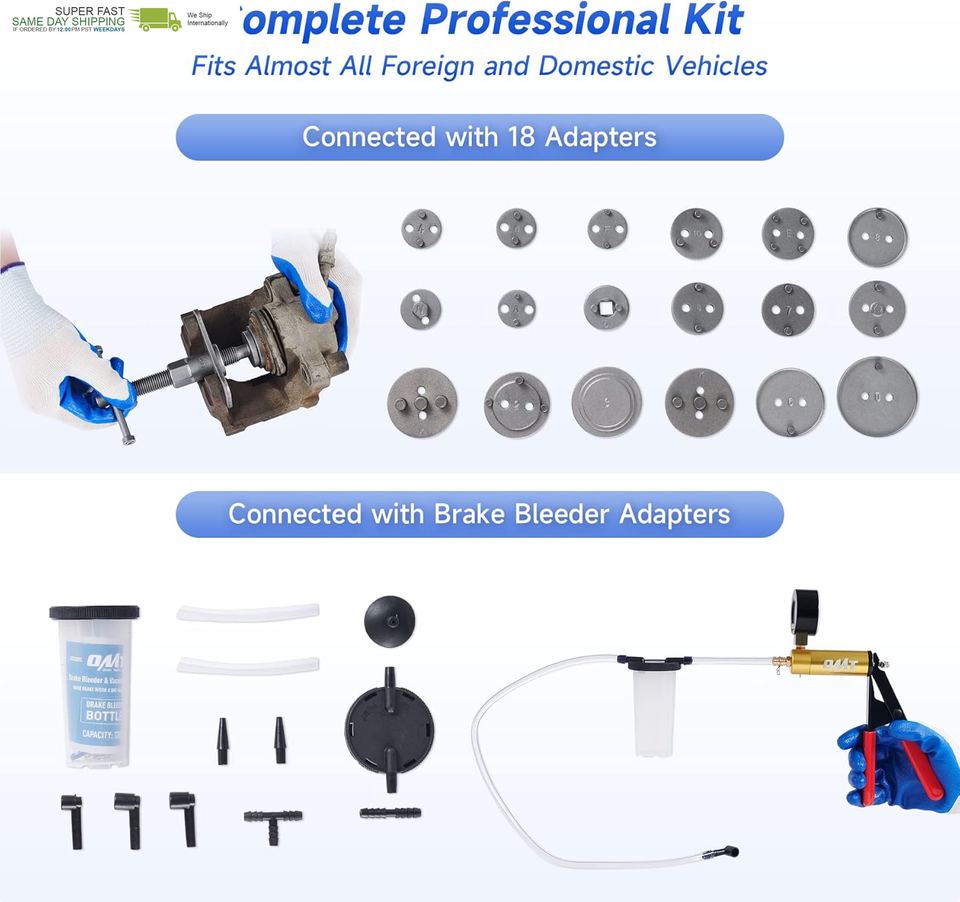 WIDE COMPATIBILITY: This brake caliper compression tool includes 18 adapters to fit a wide range of vehicle makes and models, while the vacuum pump brake bleeder kit offers various adapters suitable for cars, trucks, and motorcycles