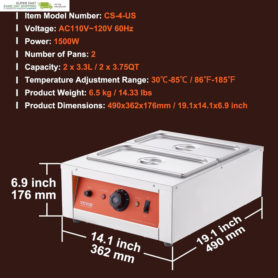 17.6 Lbs 2 Tanks Chocolate Melting Pot Temp Control 86~185?, 1500W Stainless Steel Electric Commercial Food Warmer for Chocolate/Milk/Cream Melting and Heating
