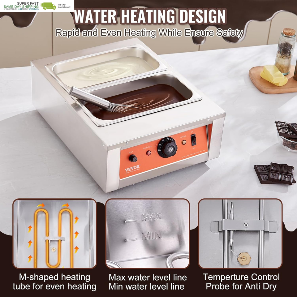 VEVOR chocolate tempering machine uses water temperature to evenly and smoothly melt chocolate, giving you a deliciously rich and perfectly flowing chocolate experience. Get ready to satisfy your chocolate cravings!