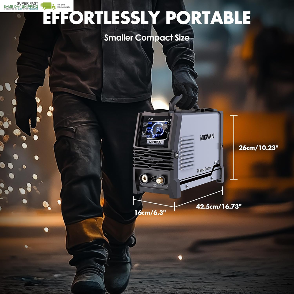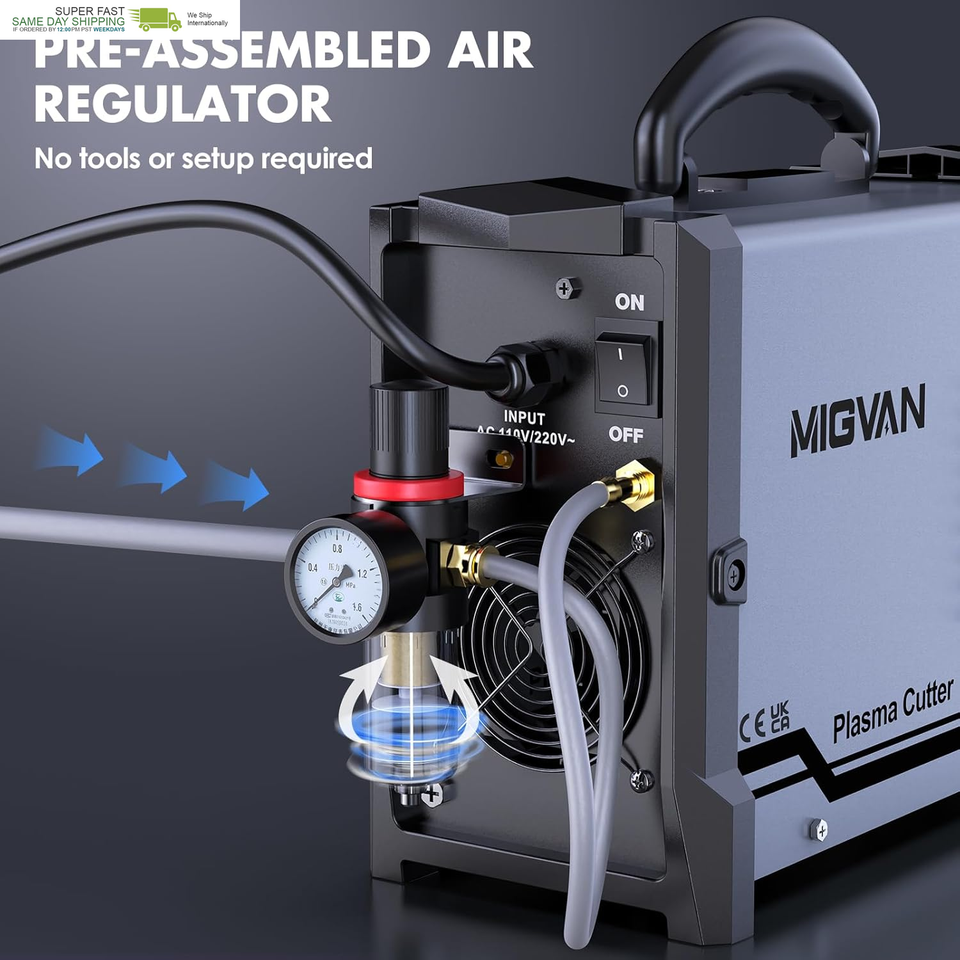 ?Jobsite-Ready in 60 Seconds?Pre-installed air filter/regulator connects to standard compressors with one-tool setup. MIGVAN Plasma cutter torch delivers precision cuts on stainless steel, copper aluminum at optimal 0.4-0.6MPa pressure. Compact size and 14.7lb portable design - lighter than most toolboxes!