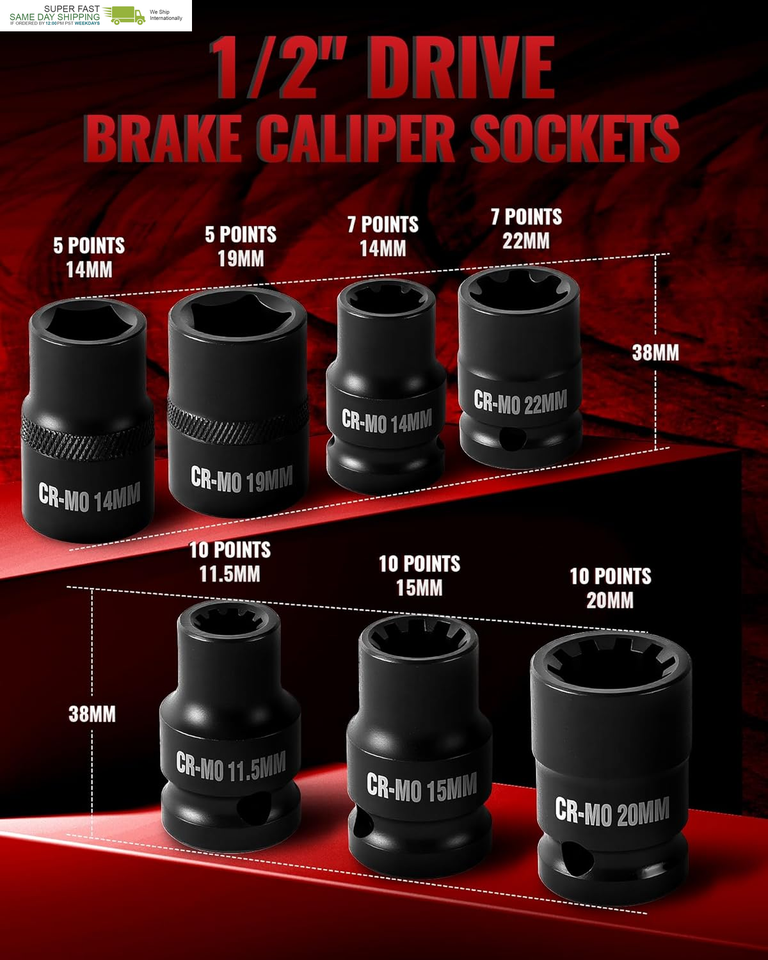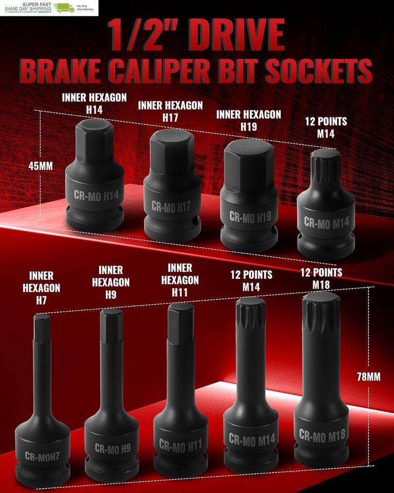 Variety of Sizes: This 1/2" drive brake caliper socket set includes 38mm-long sockets: 5pt (14/19mm), 7pt (14/22mm), and 10pt (11.5/15/20mm), with specialized bit sockets - 45mm for M14/H14/H17/H19 screws and 78mm for M14/M18/H7/H9/H11 screws
