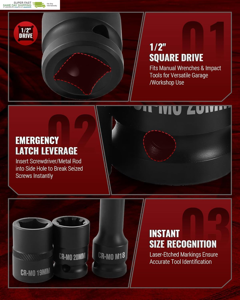 User-Friendly Design: Laser-etched sizes enable instant tool selection. Universal 1/2" drive fits wrenches, impact guns power tools. Brake caliper sockets feature side latch holes for emergency screwdriver/rod leverage
