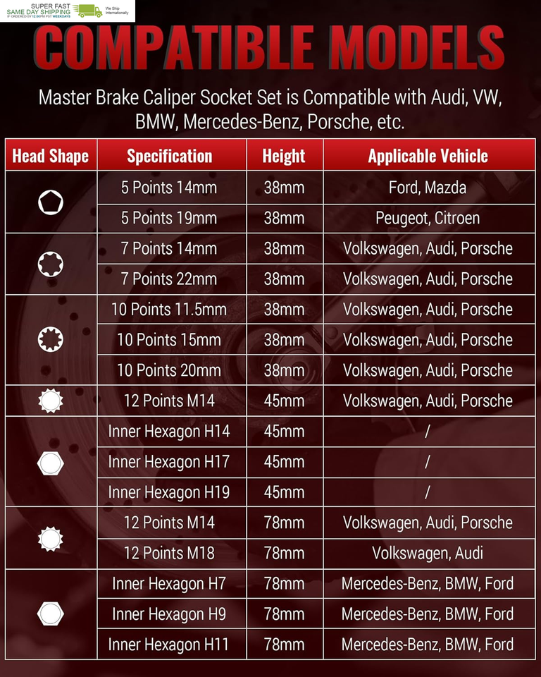 Specialized Brake Caliper Tool Set: Designed for brake caliper screw removal/installation to repair calipers or replace pads efficiently. Special sockets compatible with BMW/Audi/Ford/VW/Mercedes-Benz/Porsche and other models