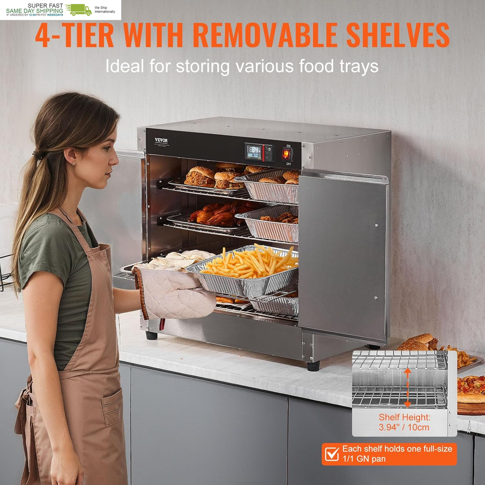 Spacious Multi-Tier Design: This food warmer cabinet includes 4 spacious shelves with a height of 3.94"/10cm, and can each hold one full-size 1/1 GN pan. The shelves are durable and suitable for various food trays, with the flexibility to be removed for taller items.