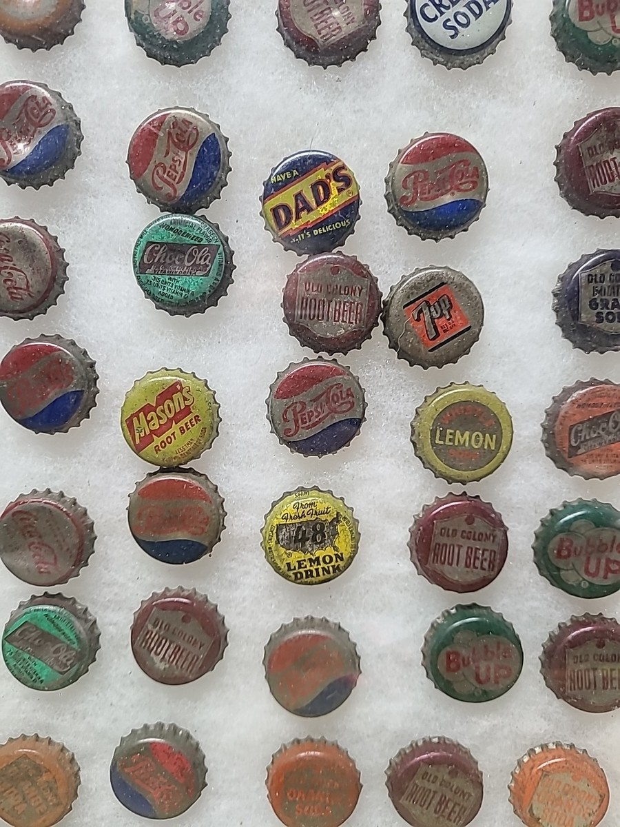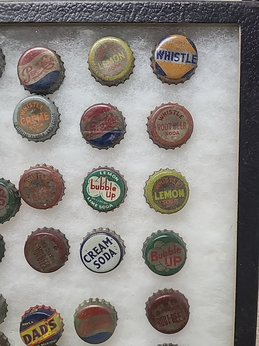 This vintage bottle cap display features a collection of 60 pieces from popular soda brands such as Pepsi, Whistle, Bubble Up, and Coca-Cola. The display is perfect for collectors of advertising memorabilia, specifically bottle caps. The variety of brands and designs on the caps makes for an interesting and unique display.