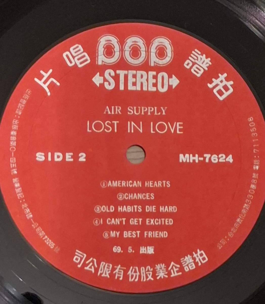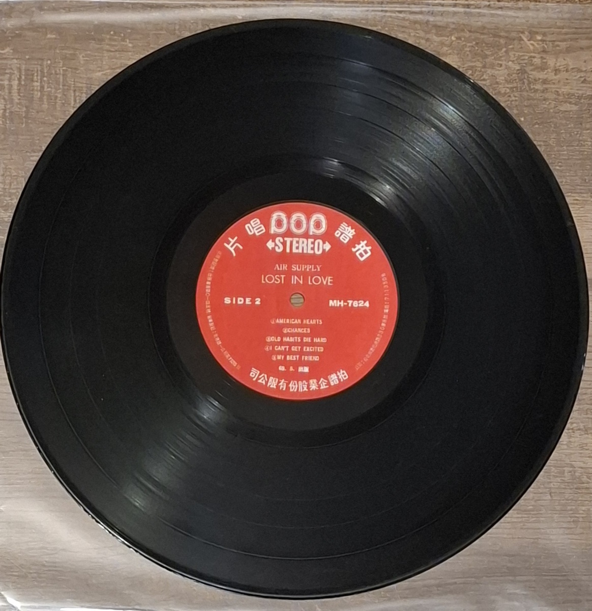This is an original Taiwan pressing of Lost in Love by Air Supply on the Pop label (MH-7624). A collectible international copy with bilingual labels and distinctive Taiwan presentation.