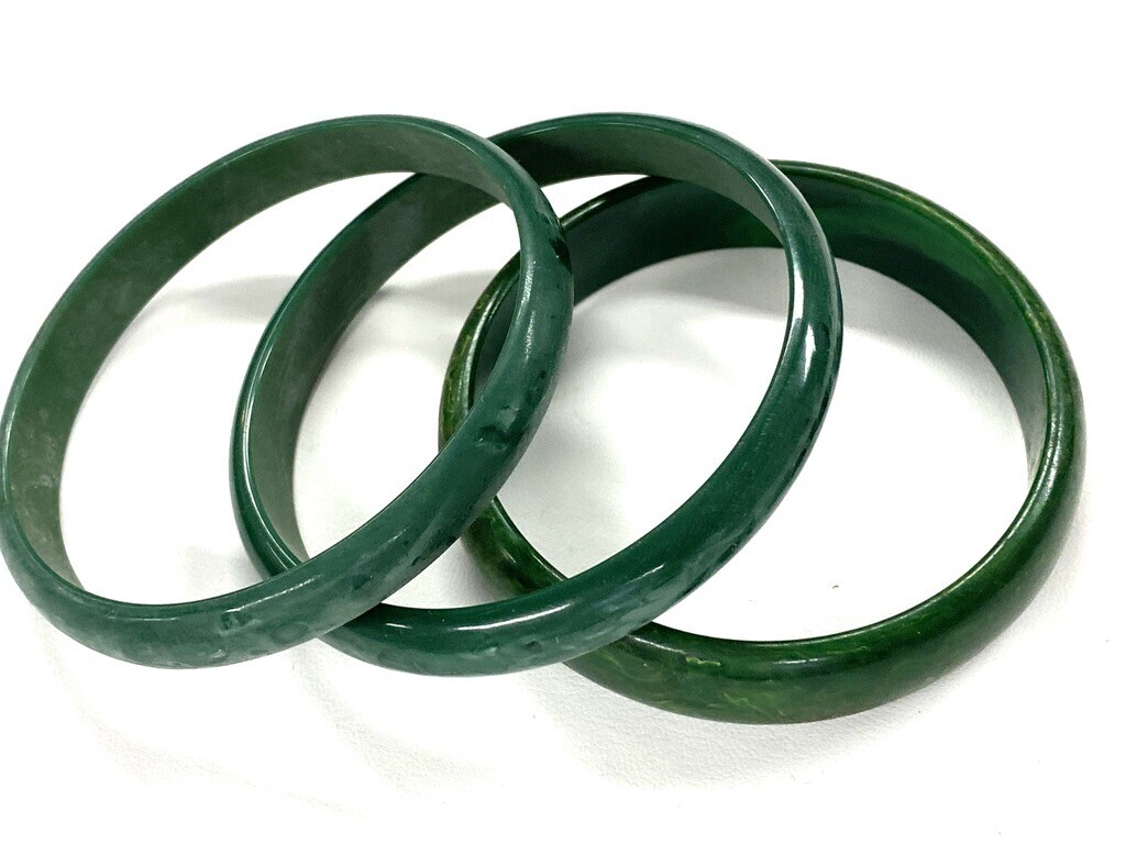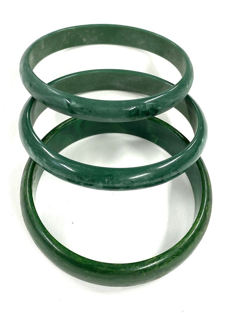 3 GREEN MOTTLED BANGLE BRACELETS 1 Bakelite 2 Celluloid 1920s-40s Art Deco