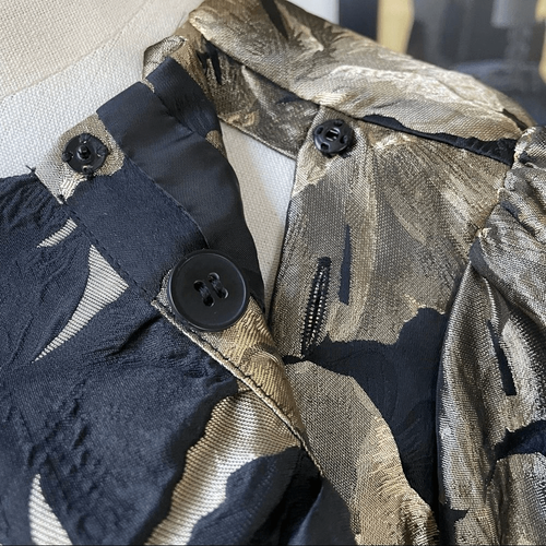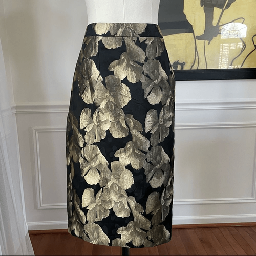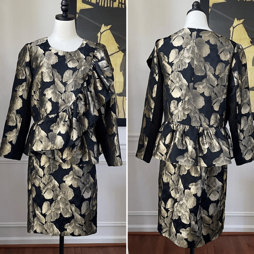 Gold foil and black Ashro three piece set that can be mixed and matched to create many different looks. The jacket is peplum style buttoning along the bias front with a ruffle that snaps into place at the shoulder. The skirt is pencil style with a back zip and the ankle pants have hook and zip closure and are patterned on the front and solid black stretchy Ponte fabric on the back with welt pockets. The details on this set are stunning ensure to draw attention. Measurements are approximate and taken while laying flat. 24 inches from shoulder to hem on the jacket and 20.5 inches from armpit to armpit. The pants have a taper leg and measure 16 inches straight across the waist with a 12 inch rise and a 29 inch inseam. The skirt measures 17 inches straight across the waist and 25 inches long.