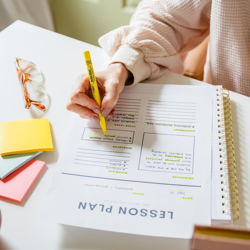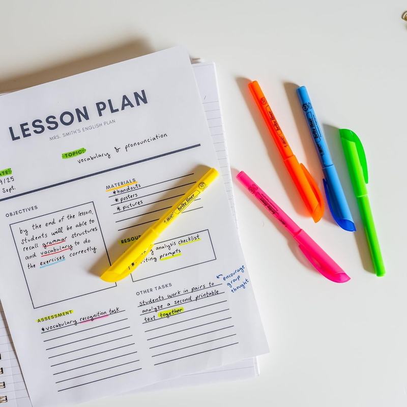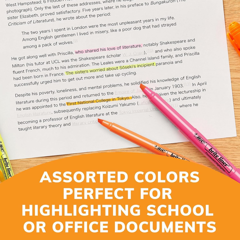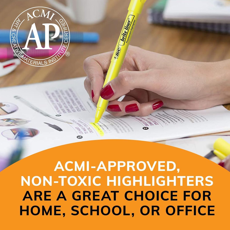 Make organization fun and easy with the BIC Brite Liner Highlighters Assorted Colors. These highlighters have a chisel tip for broad highlighting or fine underlining, making them perfect for highlighting school or office documents. BIC's highlighter markers use translucent ink to emphasize what's important on the page without obscuring the text below. Reliable and long-lasting, each BIC Brite Liner highlighter writes for up to eight hours without a cap and does not dry out, so you can work with confidence. The convenient pen-shaped design lets you easily grip and comfortably use the highlighters to organize your notes or underline passages in textbooks, notebooks and documents. Looking for classic highlighters for journals or assorted color marker sets for adults? BIC Brite Liner Multicolor Highlighters add a fun pop of flair to your art, office or school supplies. Each pack contains 12 chisel tip highlighter markers in the following assorted colors: yellow, pink, blue, gree, purple and orange. BIC highlighters are ACMI-approved for a high-quality, safe product you can trust. Whether you're emphasizing text or just feel like getting creative, choose BIC Brite Liner Highlighters.