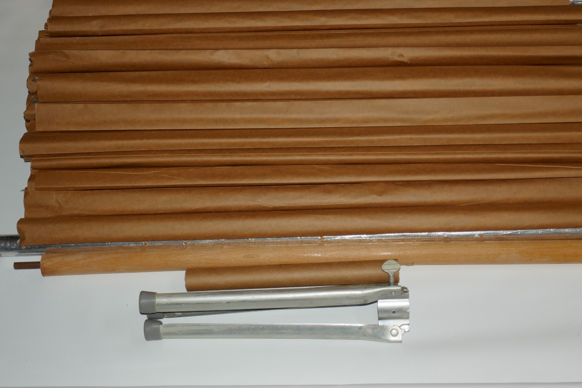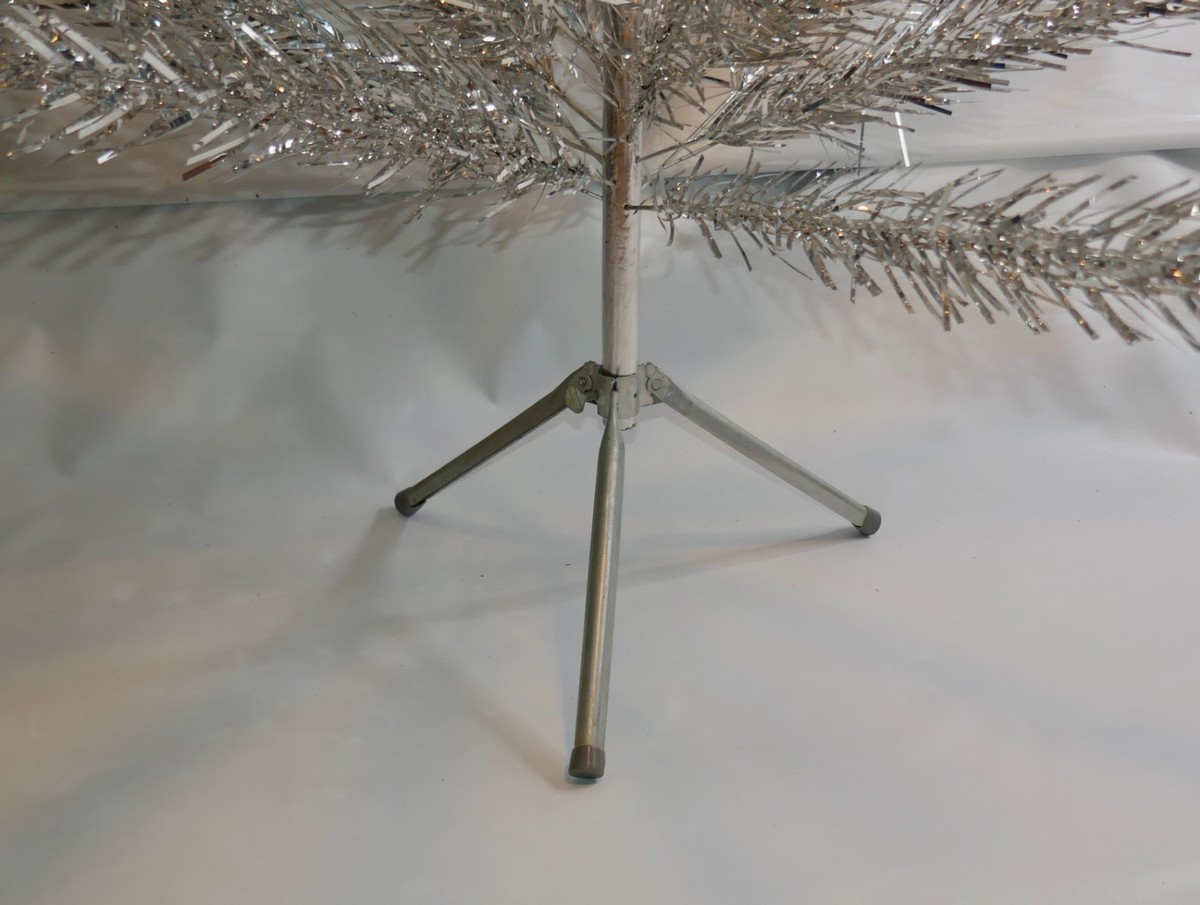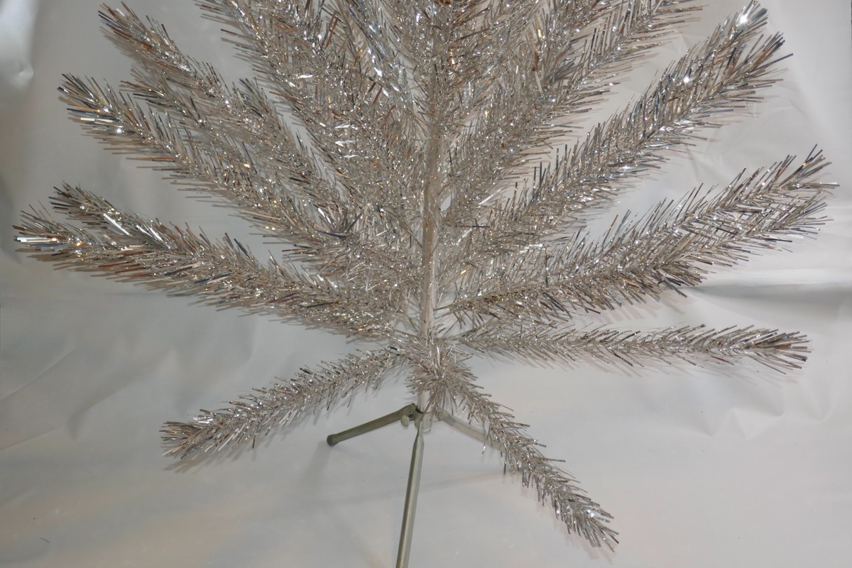 The Craft House Vintage Aluminum Christmas Tree is a beautifully crafted artificial tree that embodies the mystic and timeless charm of Christmas. Made of silver aluminum, this vintage tree from the 1960s exudes a classic and elegant appeal. This includes a stand, 2 piece trunk and 52 branches. The top part of the truck is missing the aluminum and some branches have tape at the end. The original box has wear but adds to its collectible value, making it a unique and sought-after piece for holiday enthusiasts and collectors alike.