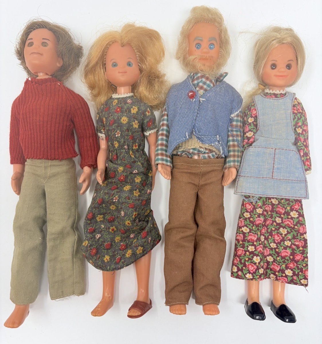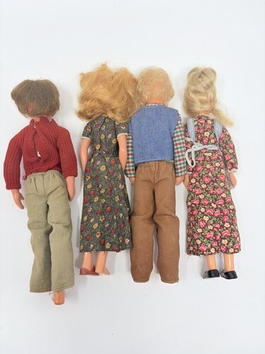 for a lot of 4 vintage Sunshine Family dolls. You get mom, dad, grandma, and grandpa. Everyone but dad is in pretty good condition. Dad is missing a leg and his eyes and his shirt is torn. Most of the doll have arms that have fused with age and they can not be raised. Most are missing shoes but have their original outfit.