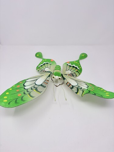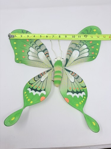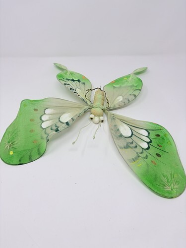 for a large vintage hand painted ceiling/wall hanging green butterfly. Wire wings with a hosiery type mesh that has been painted. Central body and eyes are plush with wire antennas. Comes with a large loop of wire on the dull side for ceiling hanging.