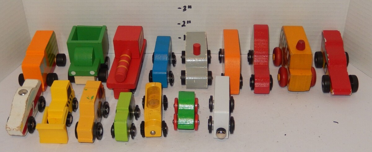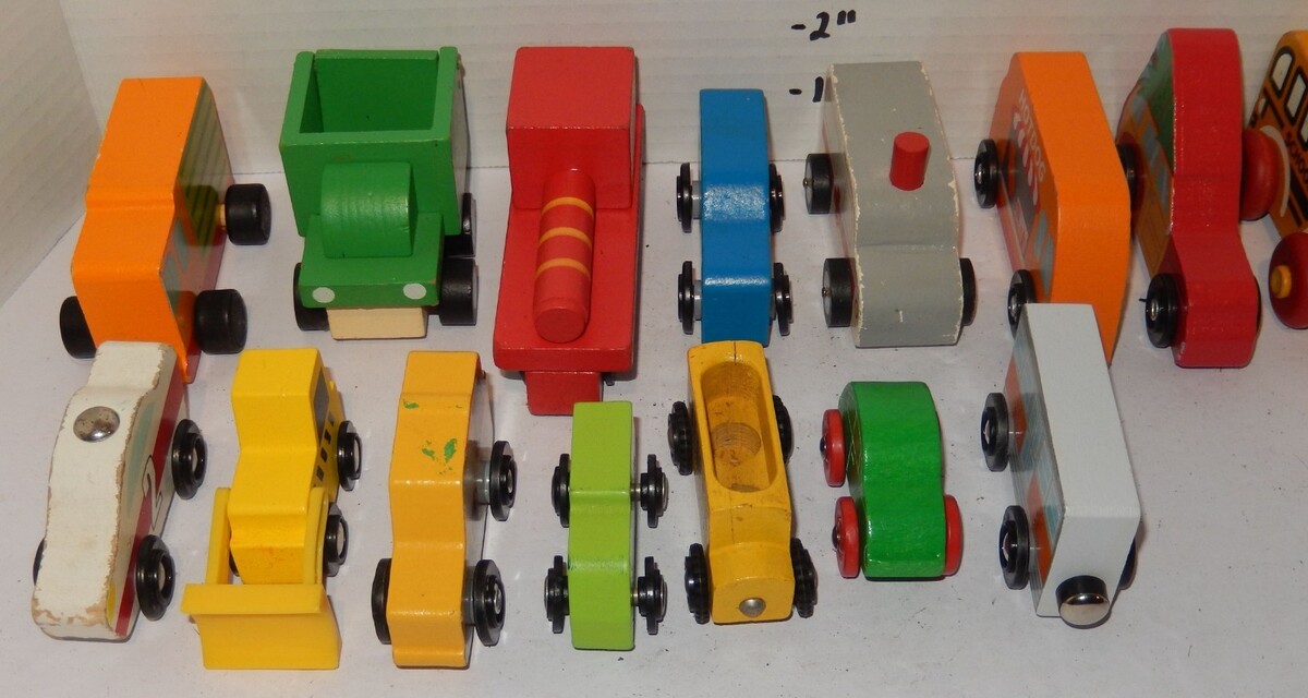 For Sale is a rare and hard to find Huge Lot of 16 Different Pretend Play Wooden Vehicles Trucks Cars Trains. in Good USED condition may have some paint wear as pictured. would make a great addition to any toy box. Please ask Any and All Questions prior to purchasing. Fast Same or Next day shipping with Free Delivery Confirmation within the U.S. Payment Due within 7 days of purchase (if you need more time please let us know In advance) we love to combine shipping is always a Yes and Most of the time Additional Items Ship for free.