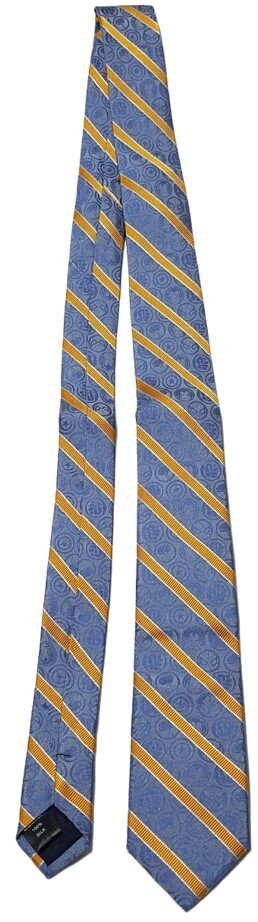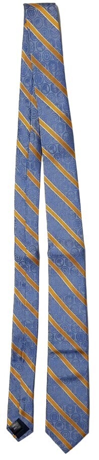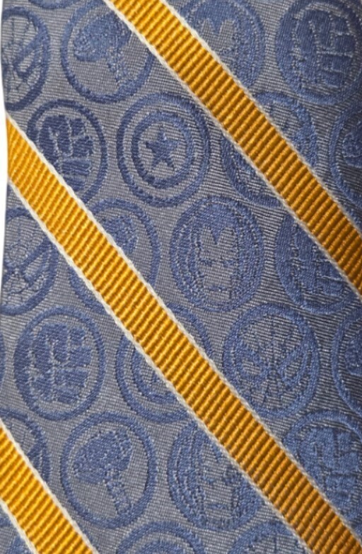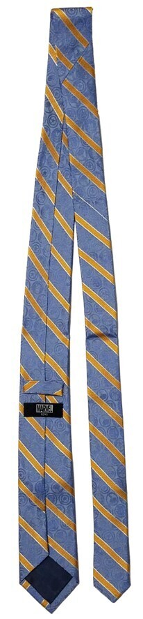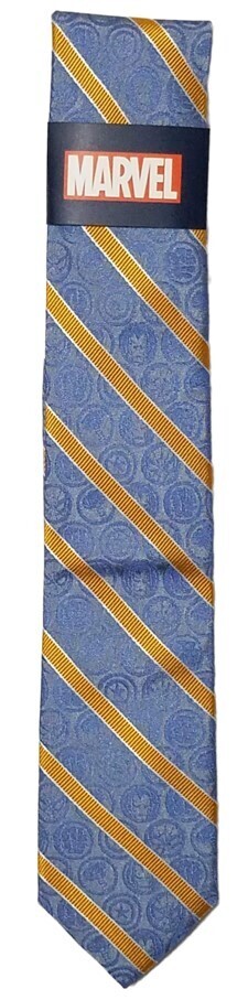 Design: The tie has gold-colored diagonal stripes over a blue background with woven blue icons of various Avengers characters.