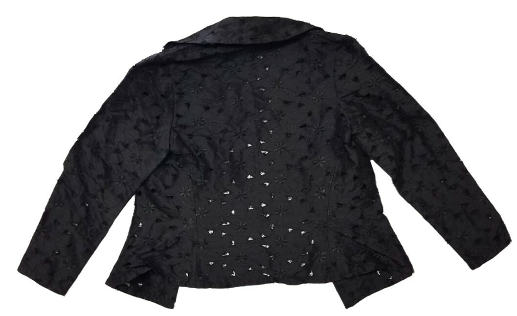 The long sleeve blazer and skirt set is made from high-quality 100% silk material with beautiful lace and eyelet accents.