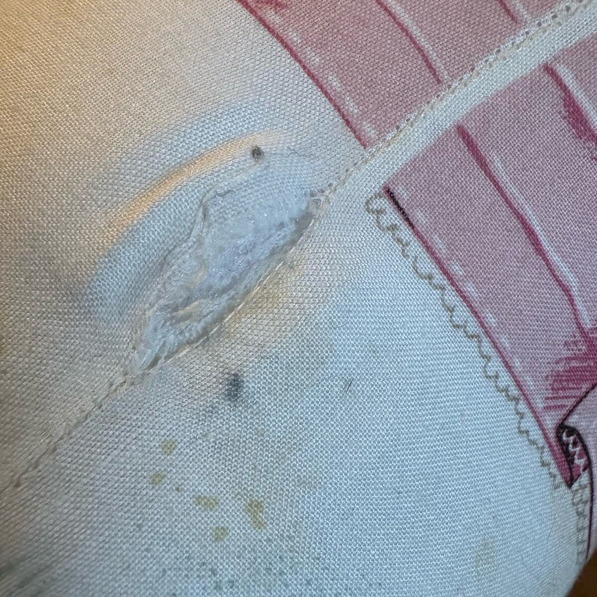 numerous spots (see pics), a few tiny tears in the seam, wear throughout