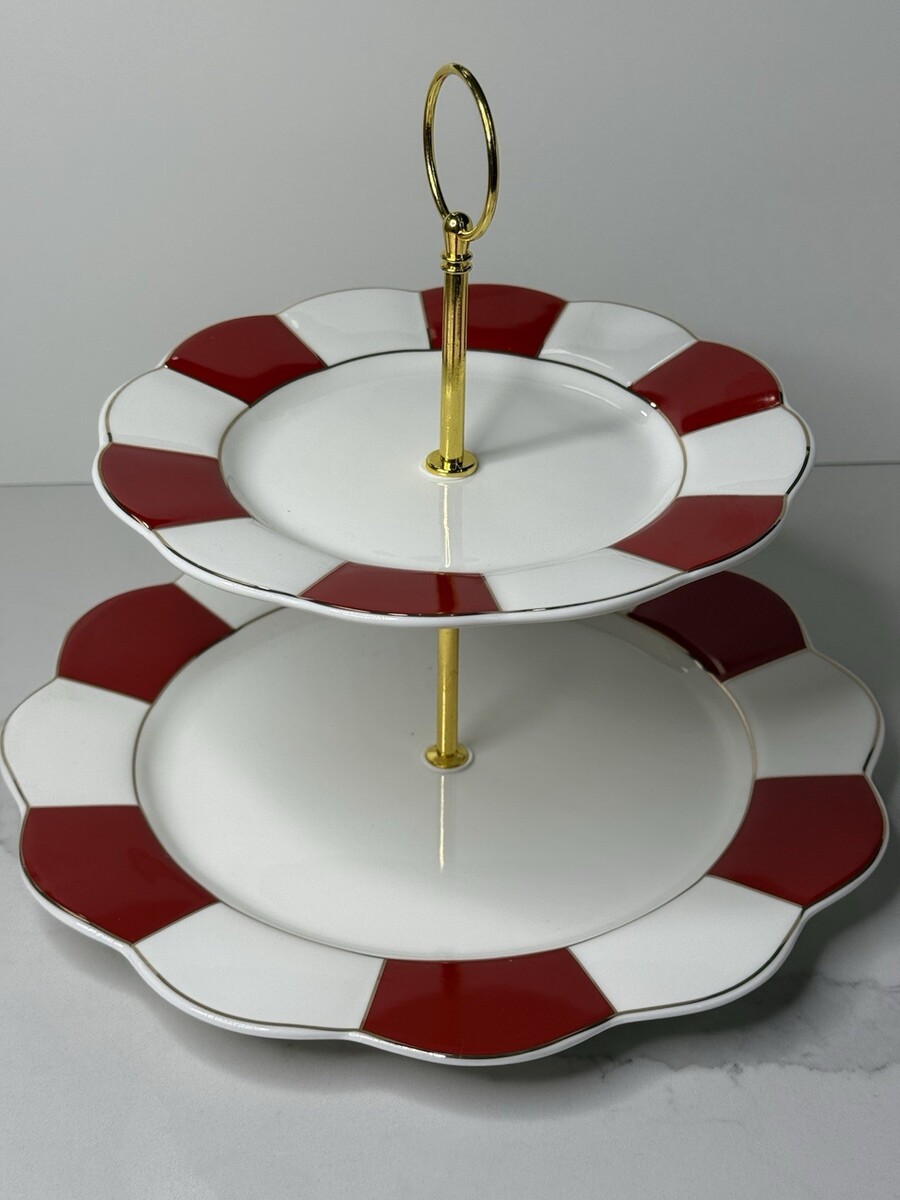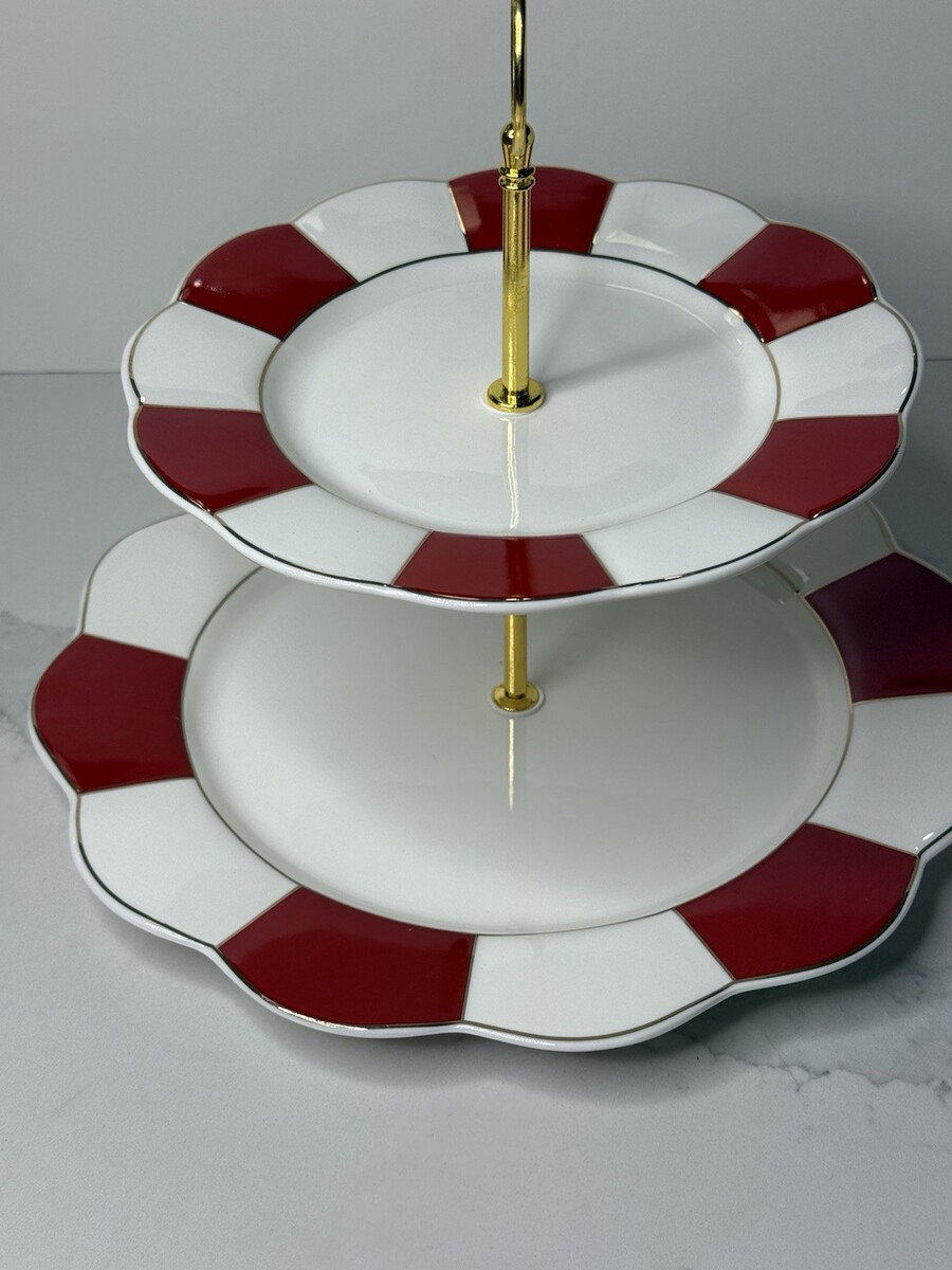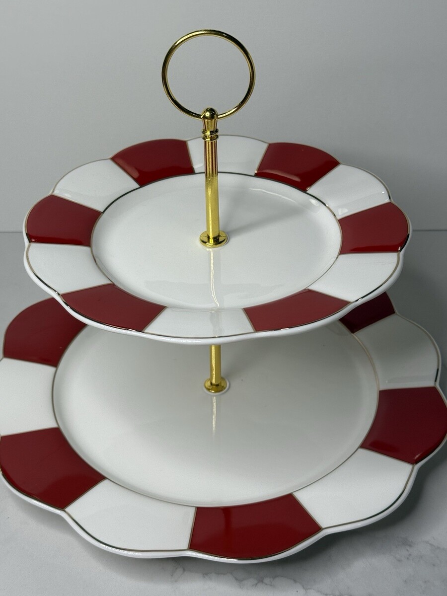 Grace Teaware scolloped Red Stripe 2 Tier Tidbit Serving Tray New