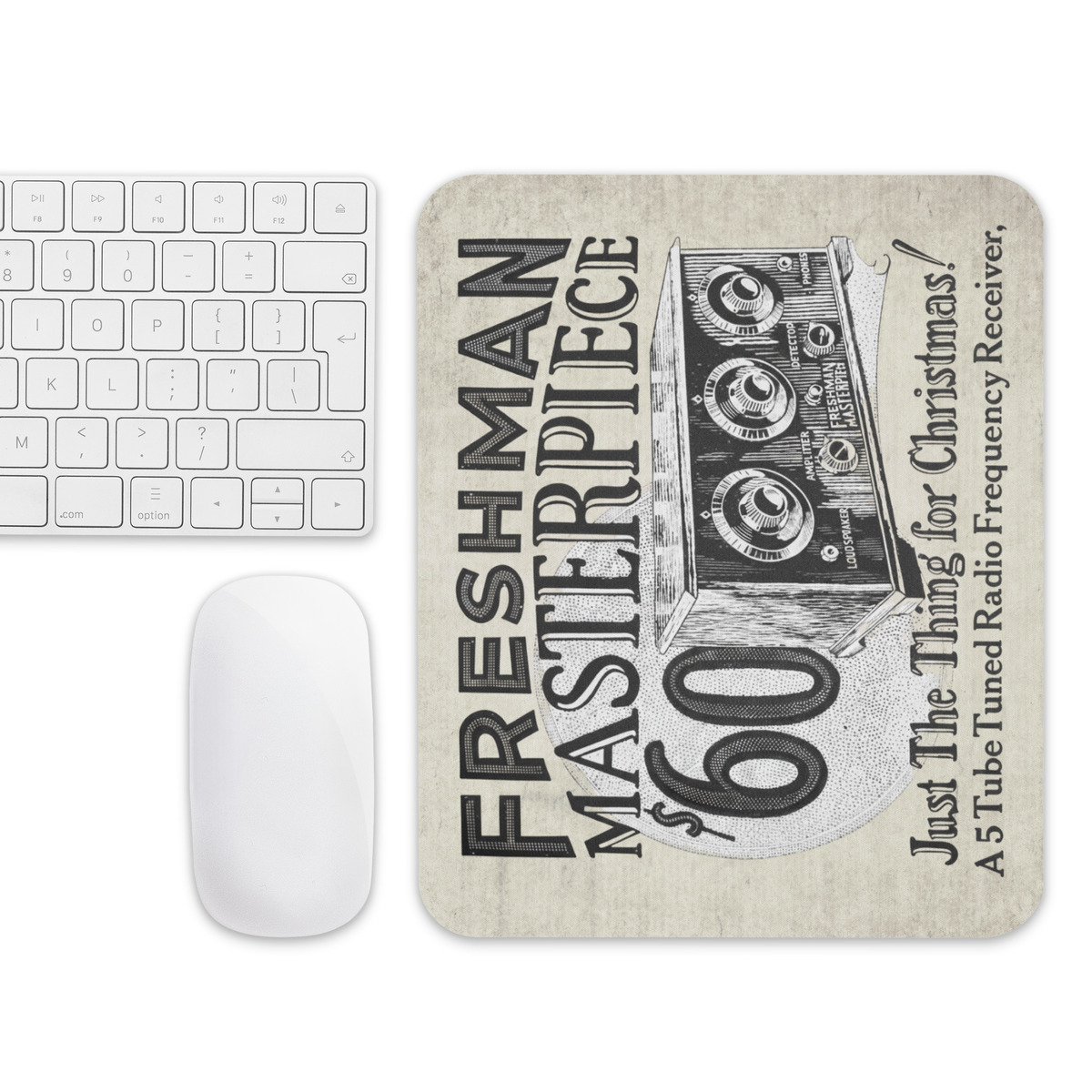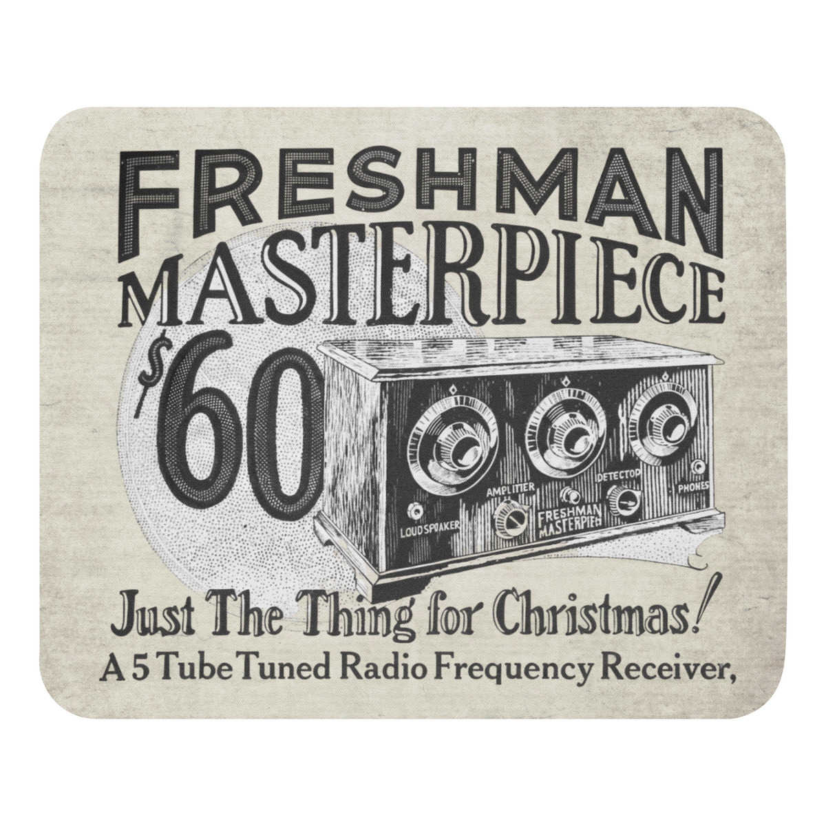 This mouse pad is inspired by an authentic 1920s advertisement for the Freshman Masterpiece radio, a beautifully engineered 5-tube tuned radio frequency receiver once proudly marketed as “Just the Thing for Christmas!”.