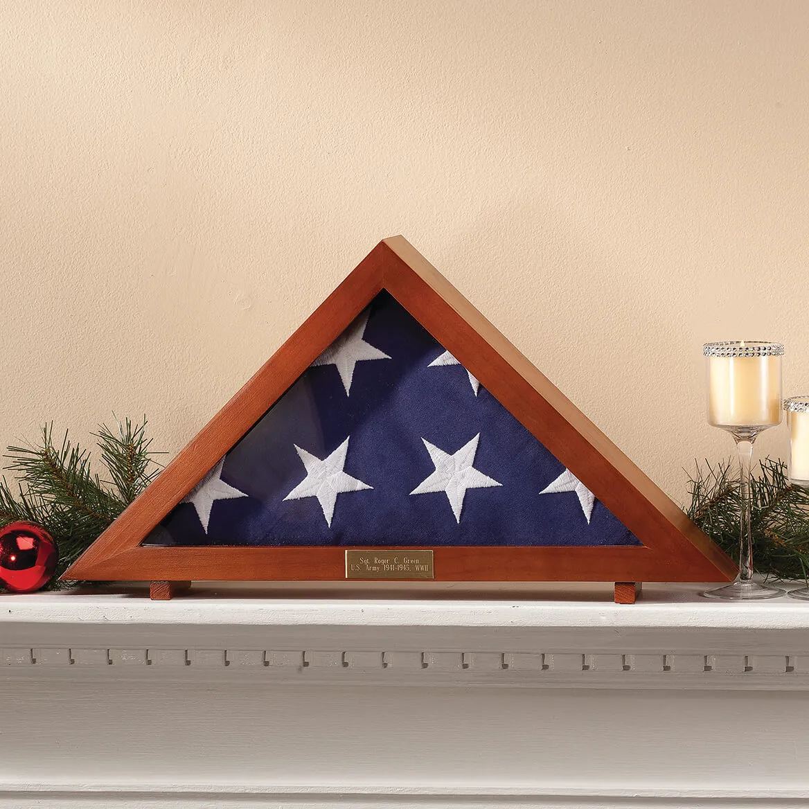 A veteran flag case is an affordable yet moving way to remember those who have proudly served their country. Engrave a loved one's name, rank and service dates on the plaque that?s included with this personalized military flag display case. You can also choose to engrave a special message on the plaque. Two lines of customization are available, up to 50 letters/characters per line. Specify your personalization and we?ll customize your personalized flag case to order by engraving the gold plaque on the front. Give the gift of this fine flag case, personalized to honor your loved one. It will look impressive on any mantel, bookshelf or table.