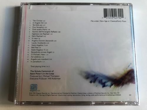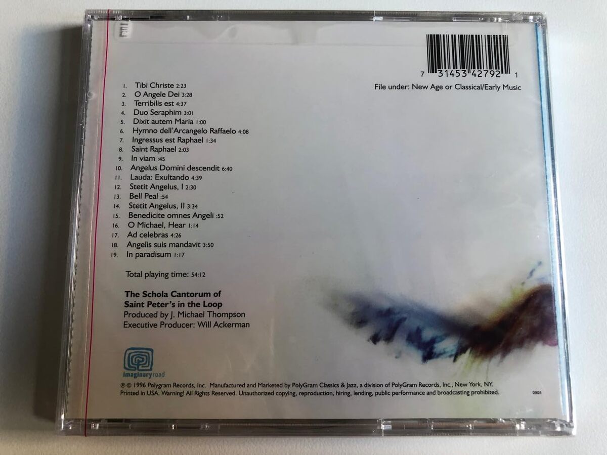Product description: The Song Of Angels / Imaginary Road Audio CD 1996 / 314534279-2 UPC 731453427921 // Label: Imaginary Road ? 314534279-2 Format: CD Country: US Released: 1996 Genre: Electronic, Classical, Folk, World, Country Style: Religious, Gospel, Neo-Classical, New Age // Tracklist: 1 Tibi Christe 2 O Angele Dei 3 Terribilis Est 4 Duo Seraphim 5 Dixit Autem Maria 6 Hymno Dell'Arcangelo Raffaelo 7 Ingressus Est Raphael 8 Saint Raphael 9 In Viam 10 Angelus Domini Descendit 11 Lauda: Exultando 12 Stetit Angelus 13 Bell Peal 14 Stetit Angelus, II 15 Benedicie Omnes Angeli 16 O Michael, Hear 17 Ad Celebras 18 Angelis Suis Mandavit 19 In Paradisium Executive-Producer ? Will Ackerman Producer ? J. Michael Thompson