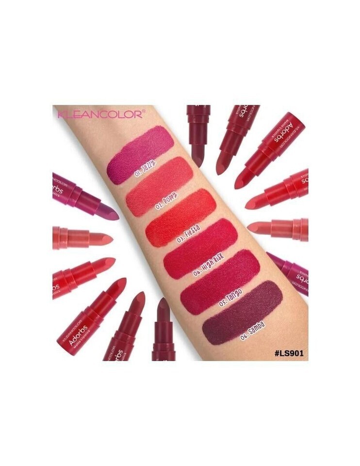 Introducing the KleanColor Adorbs Matte Lipstick collection, featuring six irresistible shades of red that range from playful pinks to sultry deep berries. These matte lipsticks offer a buttery-soft texture, providing superior comfort and a bold, full-coverage finish in every swipe. Housed in plastic tubes with a sleek, colorful design.