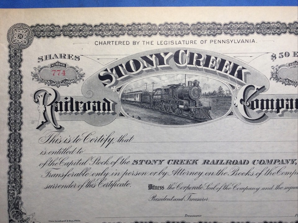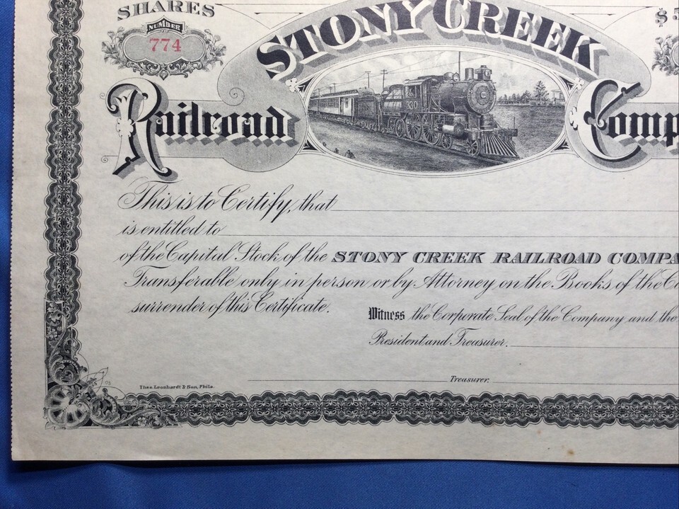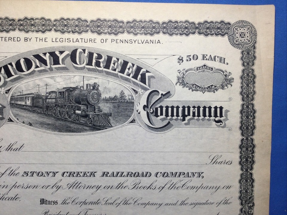 Vintage UNUSED Stock Certificate Stony Creek Railroad Company - Pennsylvania