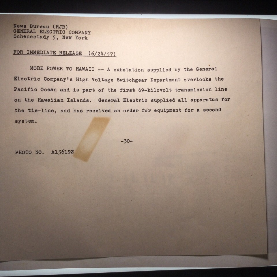 Rare vintage GE General Electric Official Press photo HAWAII 1957 1st 69 Kilovolt line to islands. BEFORE HAWAII STATEHOOD. 8? x 10? FREE Shipping