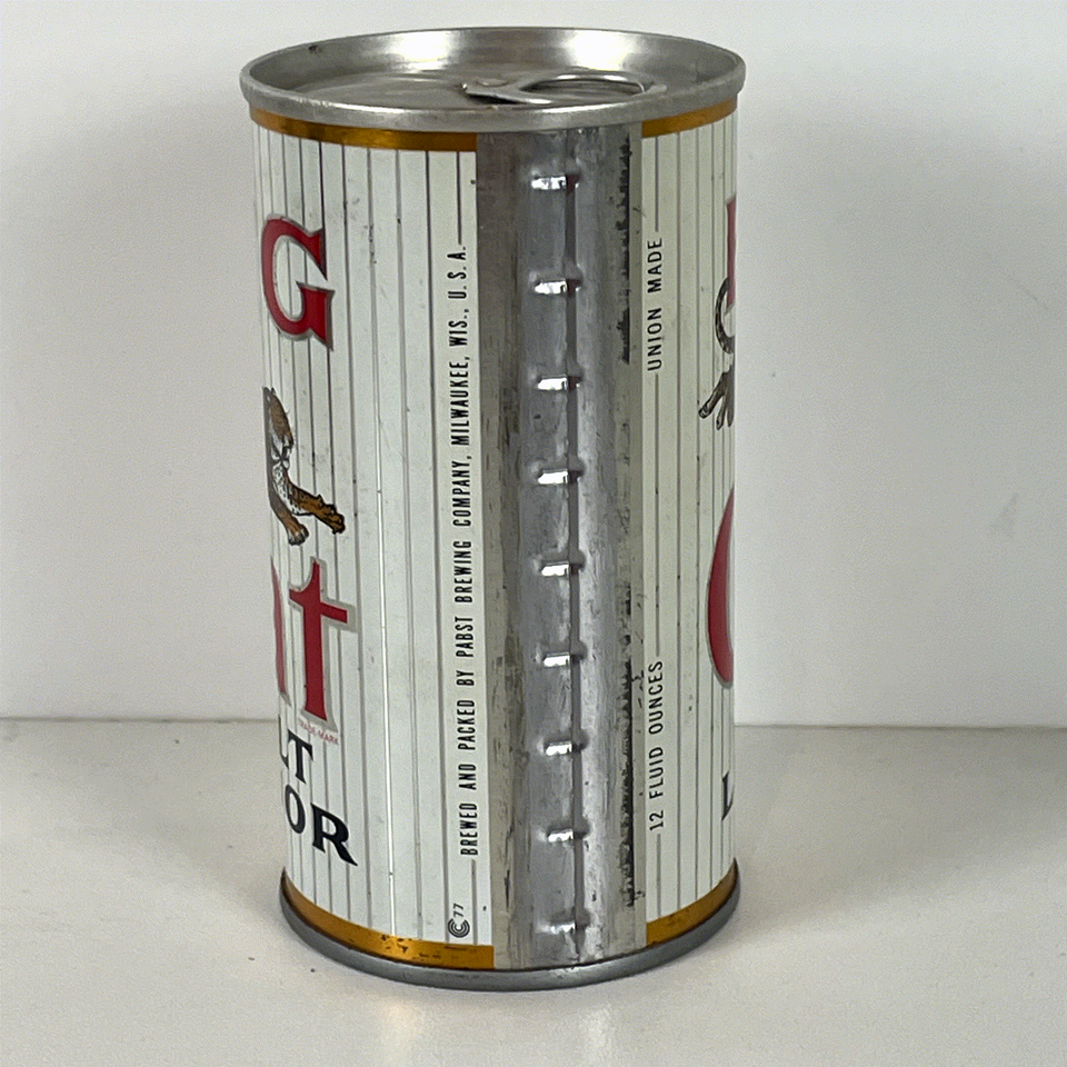 Measuring approximately 12 fluid ounces, this Big Cat can is a great addition for collectors of breweriana and vintage beer memorabilia. The detailed artwork and gold accents on both top and bottom rims enhance its decorative value. This malt liquor can, brewed and packed by Pabst Brewing Company in Milwaukee, Wisconsin, USA, is union made and represents mid-20th century American beer packaging craftsmanship.