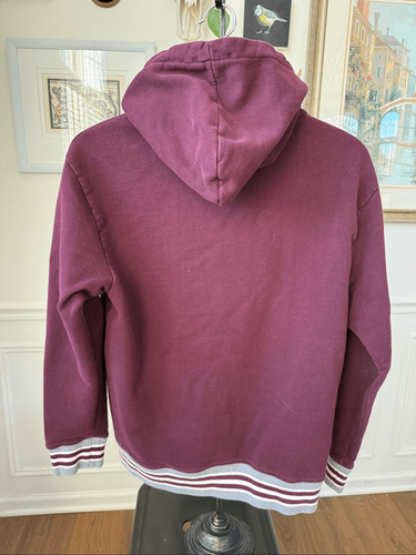 American Eagle outfitters 100% cotton burgundy, pullover hoodie with kangaroo pocket and varsity style striping at the ribbed waist and cuff in burgundy, gray, and white. Logo drawstring rivets. Logo on waist band. Tag size medium. Laying flat measures 22 inches armpit to armpit and 25 inches shoulder to hem.