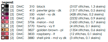 Extra skeins of 310 (black) and 718 (plum) as primary colours