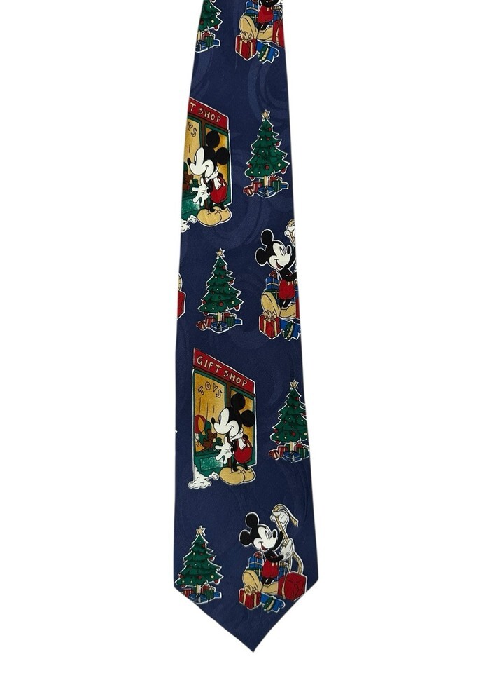 This vintage Disney Mickey Mouse gift shop tie is a unique and festive accessory for men, perfect for the holiday season. Made of 100% silk, the blue tie features a pointed style and is adorned with the beloved Mickey Mouse character.