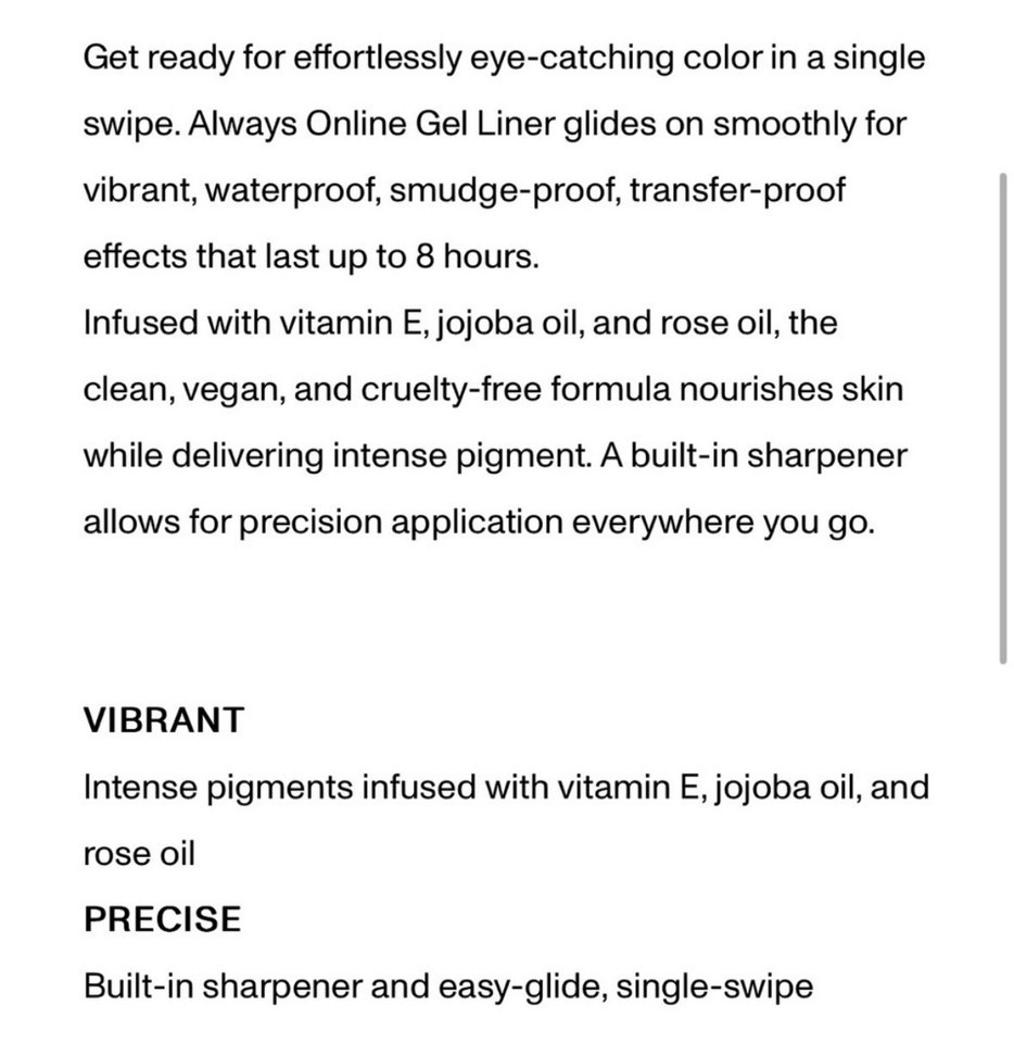 Get ready for effortlessly eye-catching color in a single swipe. Always Online Gel Liner glides on smoothly for