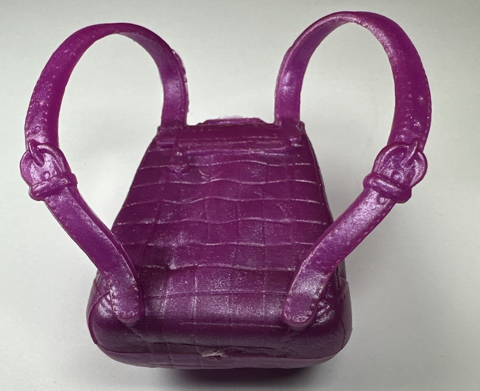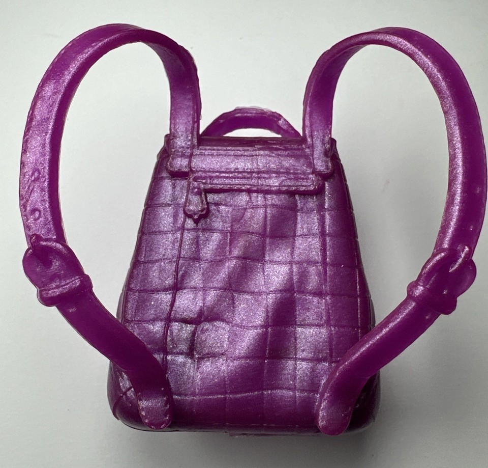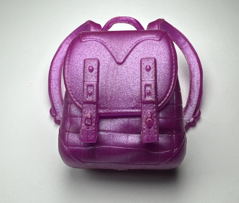 The Barbie Stacie Bedroom Space Discovery Replacement Purple Backpack is a single unit accessory designed for a Barbie fashion doll. Made of plastic, it features a purple color and measures approximately 2 1/4 inches x 2 3/8 inches. Manufactured by Mattel in 2021.