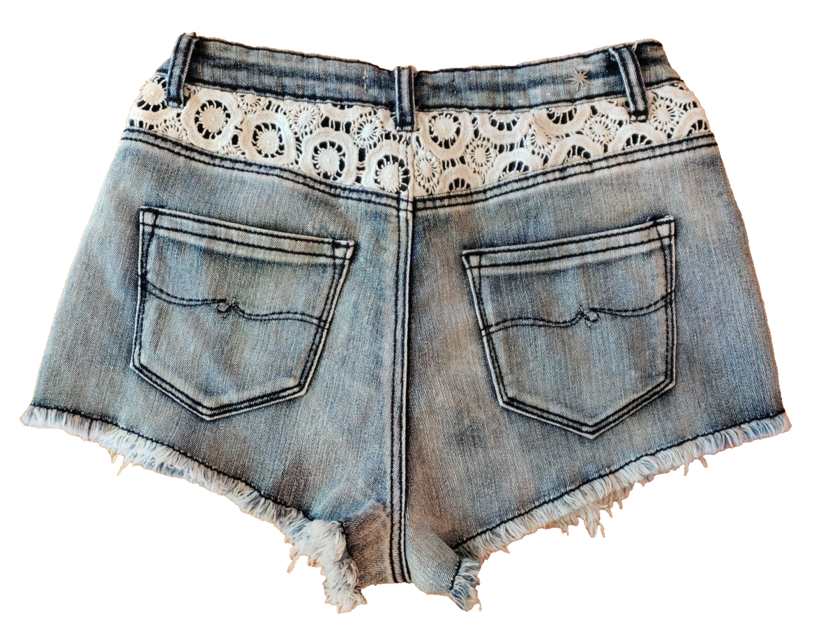 Almost Famous Mini Booty Shorts Womens 7 Hi Rise Crochet Blue Jeans Distress Raw