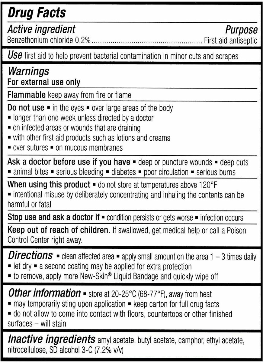Contains 0.3 fl. oz. bottle of New Skin Liquid Bandage. Provides instant antiseptic treatment for hard-to-cover cuts, wounds, scrapes, calluses, and dry, cracked skin by creating a rapid drying, tough protective barrier while allowing the skin to breathe