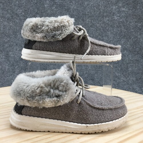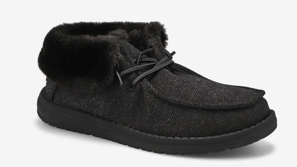 As the temperature outside drops, the Britt Chukka ankle-high booties from HEYDUDE made from canvas serve as a great compliment to those favorite jeans. The faux fur inner lining that extends over the foldable cuff provides ideal warmth while adding that classic winter boot looks to a casual comfort shoe.