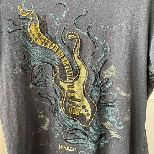 Hard rock Cafe 100% cotton Boston T-shirt, featuring an abstract guitar on the front with some embroidery detailing. The print is mildly distressed. There is a pinhole at the back neck that I didn?t notice until pictures. See photos. Measurements are approximate and taken while laying flat:26 inches shoulder two ham and 22 inches armpit to armpit. Perfectly broken in.