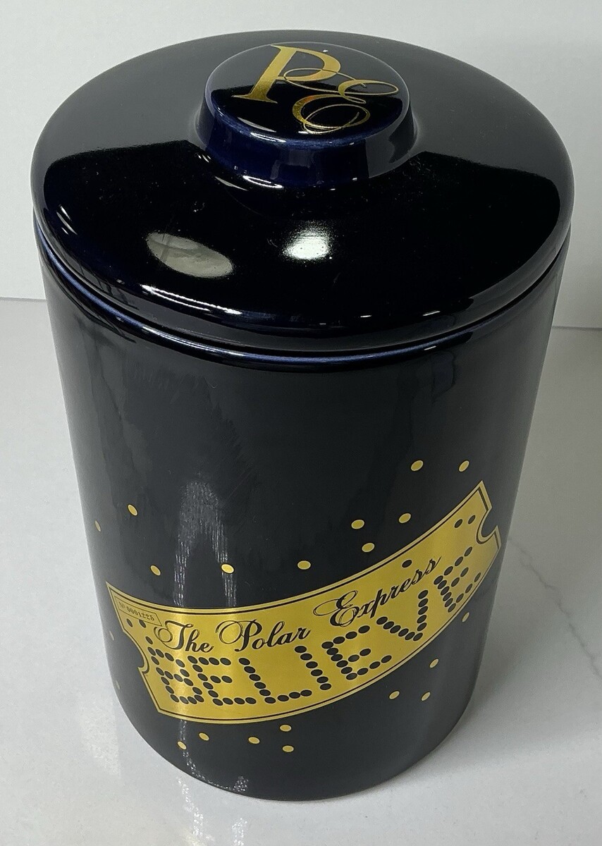 The Polar Express BELIEVE Gold Ticket Blue Cookie Jar Canister 8" Christmas New