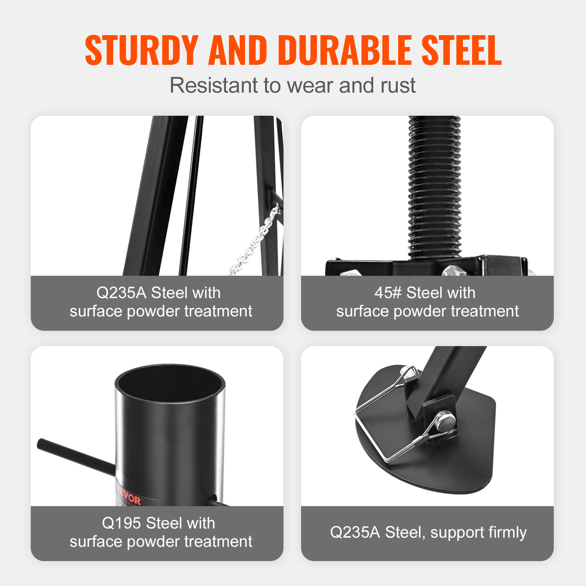 Built to Last: Crafted from high-strength Q235A steel for the jack base and Q195 steel for the hitch cup, our 5th wheel stabilizer tripod is engineered for durability. The powder-coated surface resists corrosion and rust, while the sturdy 45 steel screws ensure a long service life.