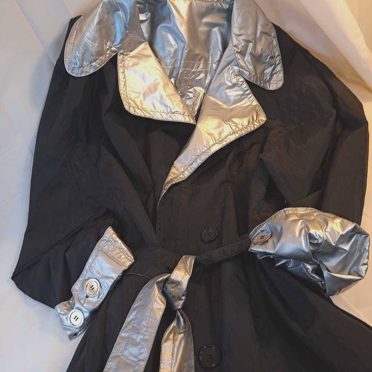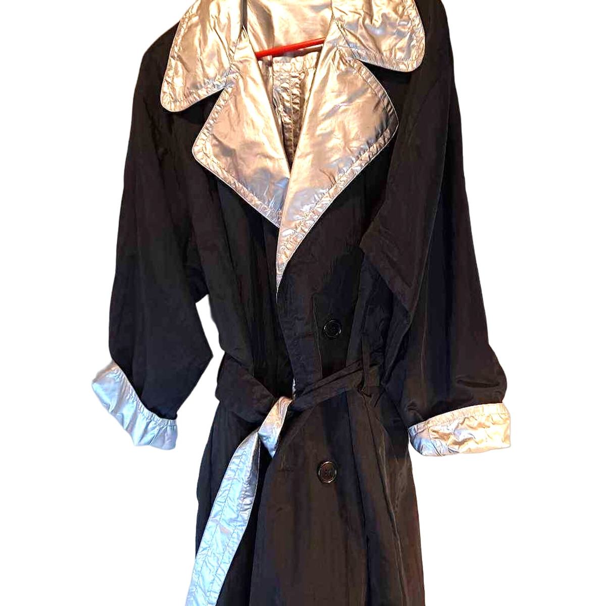 Reversible Women's Raincoat Black Shiny Silver Buttons Collar Belted Pockets M